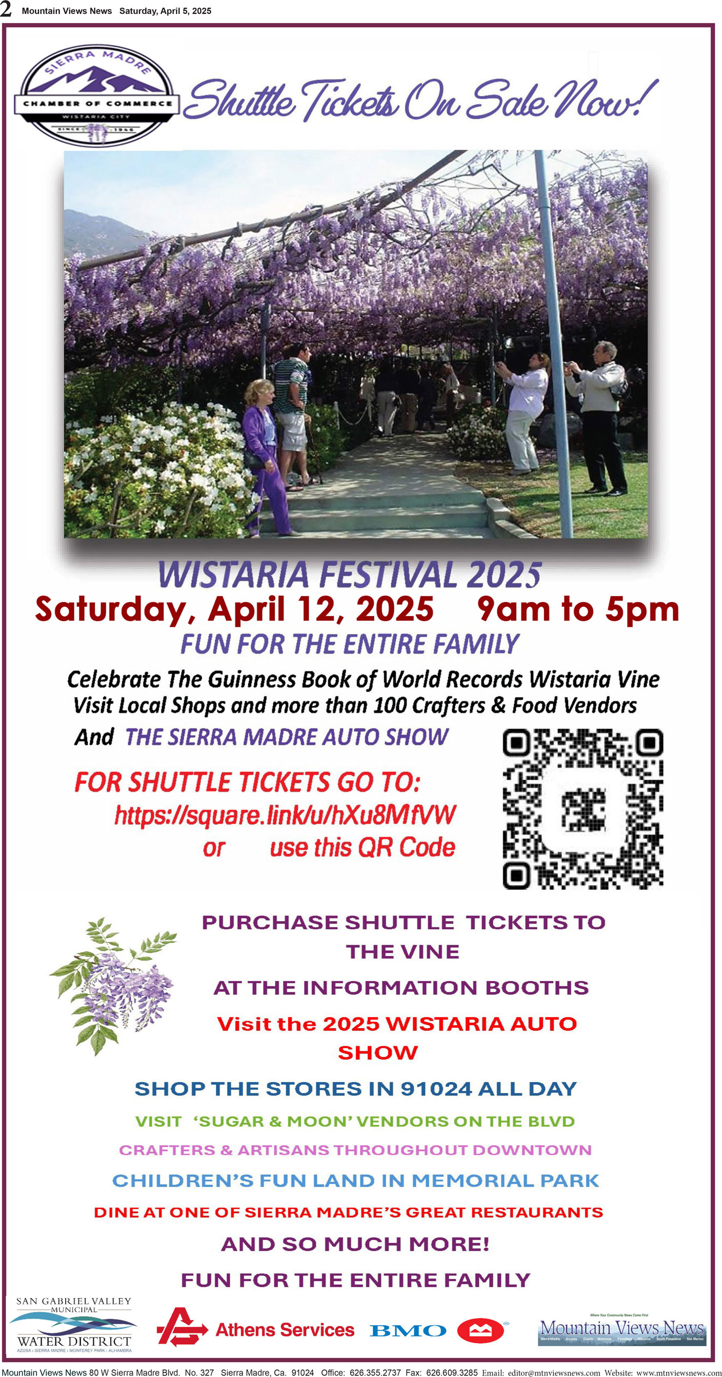 Mountain Views News 80 W Sierra Madre Blvd. No. 327 Sierra Madre, Ca. 91024 Office: 626.355.2737 Fax: 626.609.3285 Email: editor@mtnviewsnews.com Website: www.mtnviewsnews.com